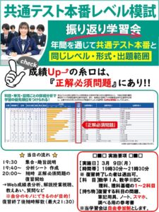 2/22(日)実施 共通テスト本番レベル模試の復習を「みんなでやろう!」ということで、 3/9(月)の夜19時30分から「振り返り学習会」を行います!! 実施科目は【数学】と【理科(理科基礎もOK)】です。 まずはWeb […]